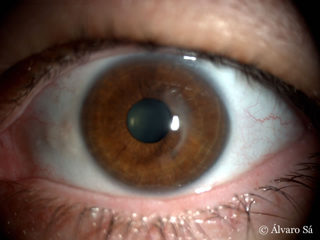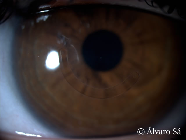 Fotografias do olho esquerdo uma semana após o explante do segmento de anel. Nota-se o leucoma (“cicatriz”) no local onde estava o segmento de Ferrara®.