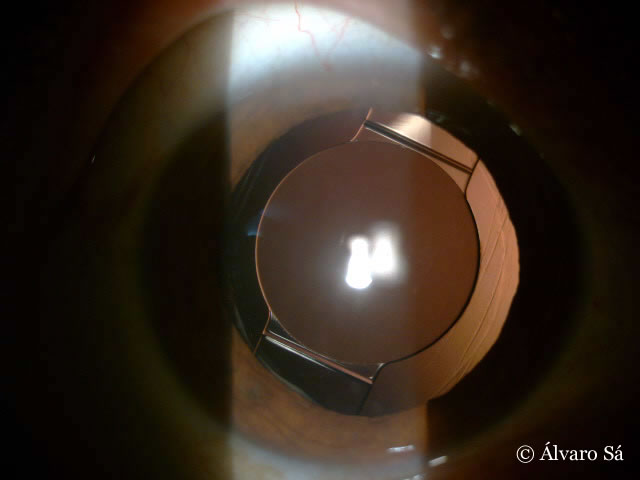Observa-se, através da pupila, o desenho da lente multifocal (pequenas circunferências concêntricas na sua face anterior – lente apodizada, asférica e difractiva – Restor®) que permite visão para longe e perto.