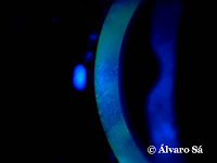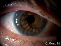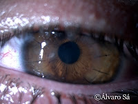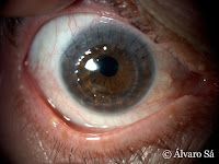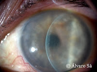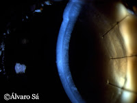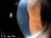 Fotografias tiradas um mês após a cirurgia de catarata. A técnica utilizada para extracção da catarata foi a “extra-capsular”, isto é, não foi utilizada a facoemulsificação para evitar a lesão das poucas células endoteliais através dos ultrasons. Apesar disso a córnea descompensou (turva, aumento da espessura, pregas e edema epitelial(microvesículas superficiais)).