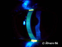 Fotografias tiradas após colocação de um tampão (Plug) no ponto lacrimal inferior, com o objectivo de permitir o contacto da lágrima durante mais tempo com a superficie ocular, através da obstrução, quase total, da sua drenagem. Ultima fotografia mostra o aspecto do olho com Plug colocado (não se observa a olho nú). Coloração amarelada, no canto do olho, corresponde a restos de fluoresceina.