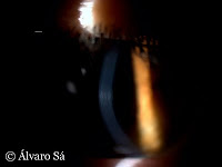 Nas fotografias observamos uma córnea descompensada, com edema do estroma (aumento significativo da espessura corneana). Na segunda fotografia observa-se em pormenor o edema microcístico do epitélio (pequenas vesículas à esquerda do feixe de luz).