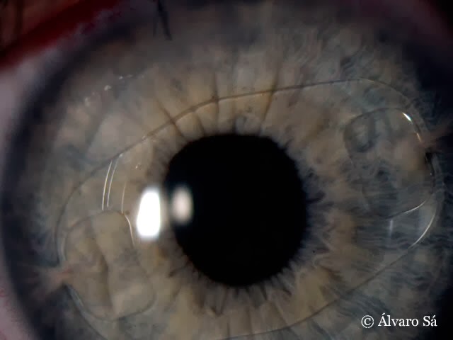 Na passada sexta feira, dia 1 de Novembro 2013, operei um rapaz de 21 anos com +4,25 -1,25×150° no olho direito e +6,25 -3,00×20° no olho esquerdo. Implantei umas lentes de câmara anterior (Artisan® Tóricas) com anestesia tópica, que corrigiram totalmente o erro refractivo de ambos os olhos. No dia seguinte via 10/10 sem correcção e o aspecto dos olhos era este…