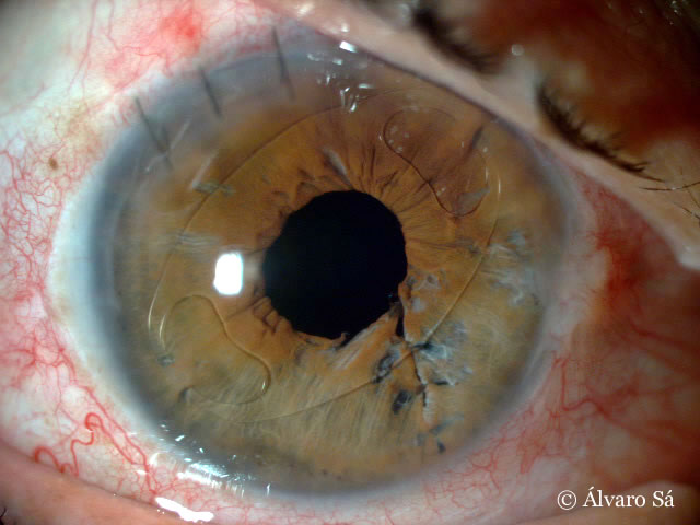 Este paciente recorreu à minha consulta há cerca de dois anos, após a cirurgia de catarata ao olho direito ter decorrido com várias complicações. Nessa altura realizei uma iridopupiloplastia para reparar o defeito da íris (ver foto). Dois anos depois, recorreu novamente à minha consulta com queixas de diplopia (dupla imagem) no referido olho. A lente intraocular estava subluxada. Neste vídeo mostro-vos como explanto a lente intraocular subluxada (com a ajuda de um anel de Malyugin) e como implanto uma lente de afaquia de fixação à íris.