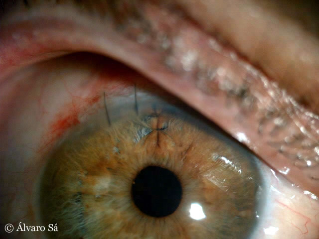 Paciente de 52 anos com Lente fáquica de câmara anterior de fixação à íris (Artiflex) implantada há 12 anos no olho direito. Queixas de má visão para longe e para perto. Muitas queixas de perturbações visuais com a luz (lente descentrada e grande iridectomia). Paciente queria deixar de usar óculos para longe e para perto. Realizei explante da lente de câmara anterior, cujo háptico do lado esquerdo tinha furado a íris; cirurgia de catarata com implante de lente Multifocal (ver fotografia com anéis da lente centrados na pupila) e iridoplastia para encerrar a iridectomia.
